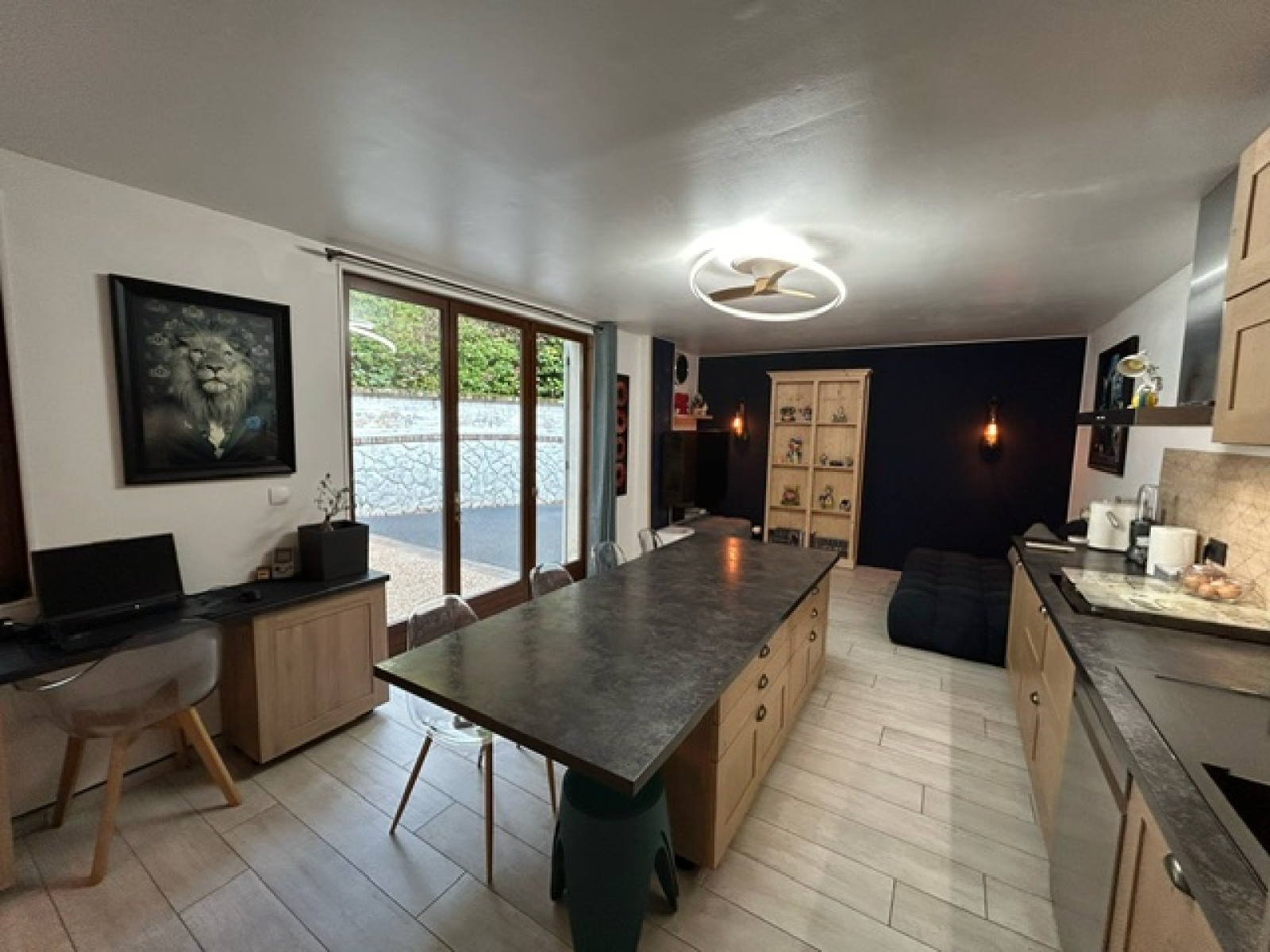 La partie habitation propose, en rez-de-chaussée une entrée, un salon/séjour avec une cuisine ouverte, une pièce actuellement utilisée comme chambre (moins de 9m²) ainsi qu'une salle d'eau