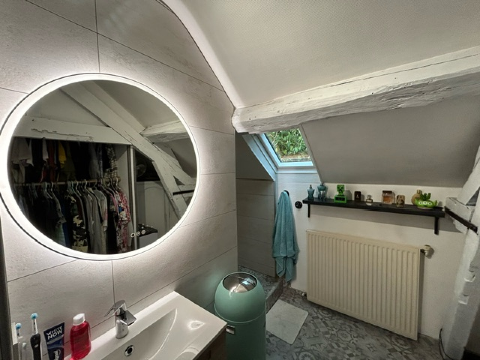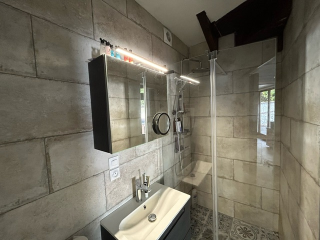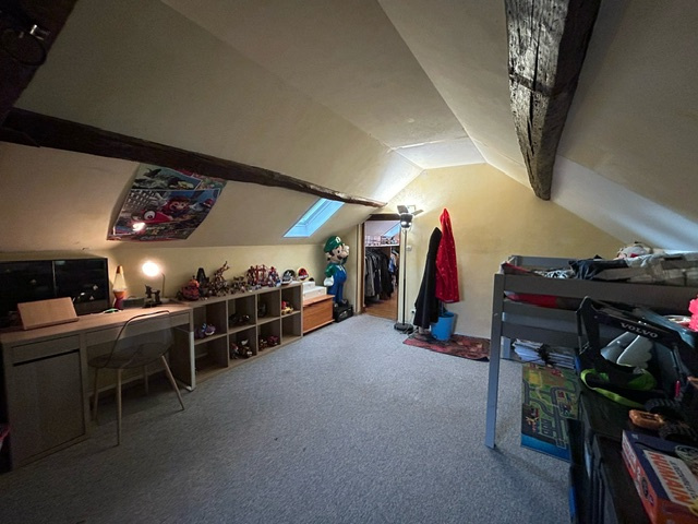 À l'étage, vous trouverez une chambre, une deuxième salle d'eau, un WC, ainsi qu'une pièce supplémentaire servant actuellement de chambre (moins de 9 m²).